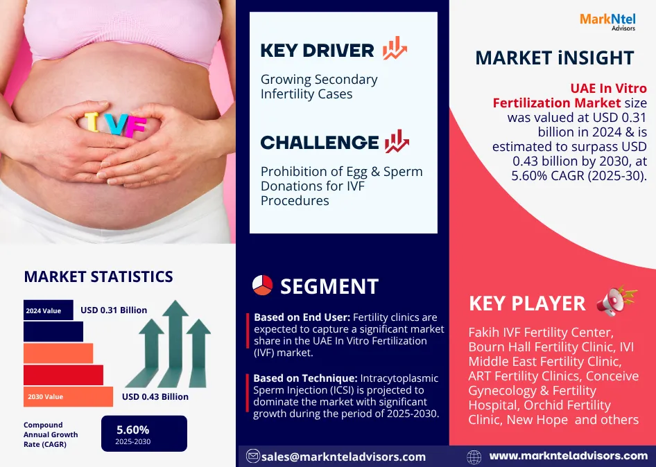 As per MarkNtel Advisors the UAE In Vitro Fertilization Market size was valued at USD 0.31 billion in 2024 & is estimated to surpass USD 0.43 billion by 2030. Along with this, the industry is also projected to grow at a CAGR of around 5.60% during the forecast period, i.e., 2025-30.