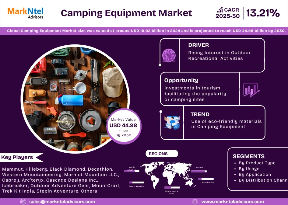 MarkNtel Advisors, a leading market research and consulting firm, has announced the release of its latest study titled Camping Equipment Market Research Report: Forecast (2025–2030). This report provides a detailed assessment of the Camping Equipment Market, covering its evolving dynamics, emerging trends, key growth drivers, major challenges, and competitive landscape.