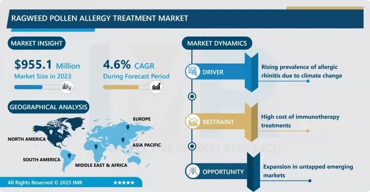 Introspective Market Research (IMR) announces a strategic assessment of the Global Ragweed Pollen Allergy Treatment Market, a sector defined by persistent seasonality and a growing shift towards disease-modifying therapies. Ragweed pollen, a notorious allergen, is responsible for allergic rhinitis (hay fever) in millions globally, particularly during late summer and early autumn. The market, valued at USD 955.1 Million in 2023, is projected to expand at a steady Compound Annual Growth Rate (CAGR) of 4.6% from 2024 to 2032, reaching an estimated USD 1,431.64 Million by 2032.