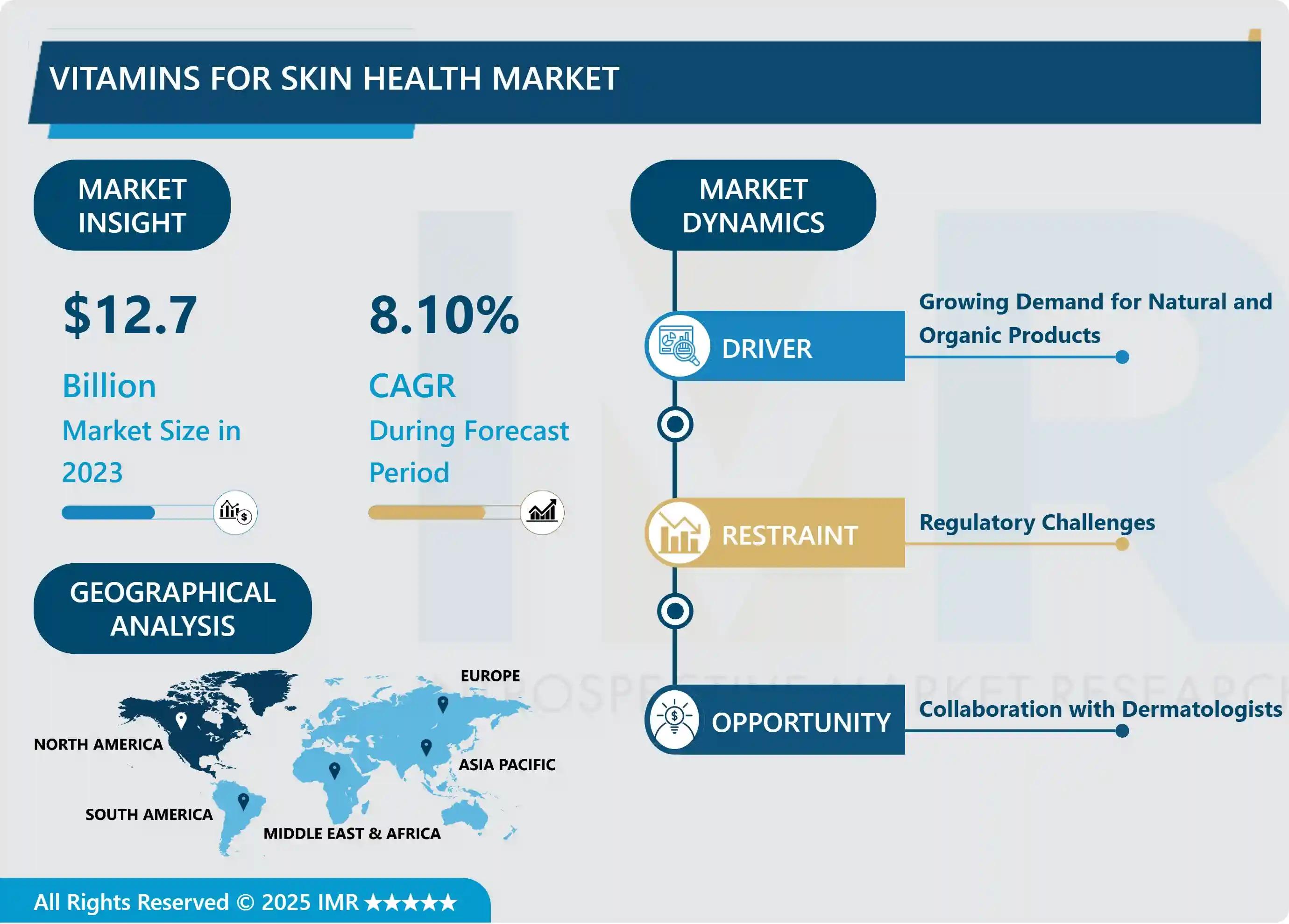 Line below: The Vitamins for Skin Health Market is segmented on the basis of Type of Vitamins, Application, and Region.