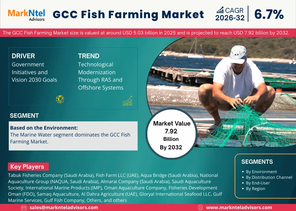 MarkNtel Advisors, a leading market research and consulting firm, has announced the release of its latest study titled GCC Fish Farming Market Research Report: Forecast (2026–2032). This report provides a detailed assessment of the GCC Fish Farming Market, covering its evolving dynamics, emerging trends, key growth drivers, major challenges, and competitive landscape.