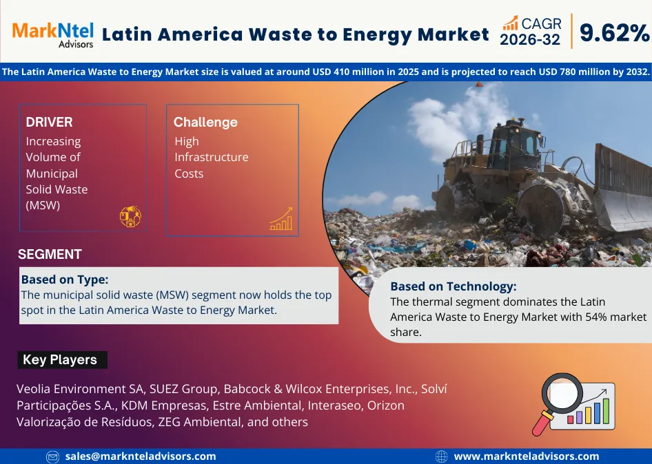 MarkNtel Advisors, a leading market research and consulting firm, has announced the release of its latest study titled Latin America Waste to Energy Market Research Report: Forecast (2026–2032). This report provides a detailed assessment of the Latin America Waste to Energy Market, covering its evolving dynamics, emerging trends, key growth drivers, major challenges, and competitive landscape.