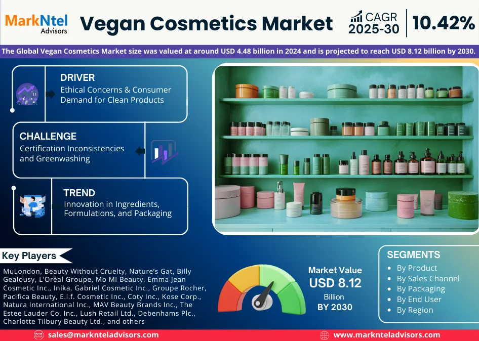 MarkNtel Advisors, a leading market research and consulting firm, has announced the release of its latest study titled Vegan Cosmetics Market Research Report: Forecast (2025–2030). This report provides a detailed assessment of the Vegan Cosmetics Market, covering its evolving dynamics, emerging trends, key growth drivers, major challenges, and competitive landscape.