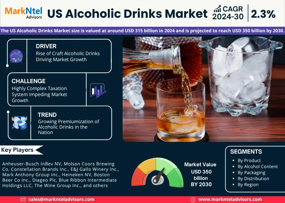 MarkNtel Advisors, a leading market research and consulting firm, has announced the release of its latest study titled US Alcoholic Drinks Market Research Report: Forecast (2024–2030). This report provides a detailed assessment of the US Alcoholic Drinks Market, covering its evolving dynamics, emerging trends, key growth drivers, major challenges, and competitive landscape.