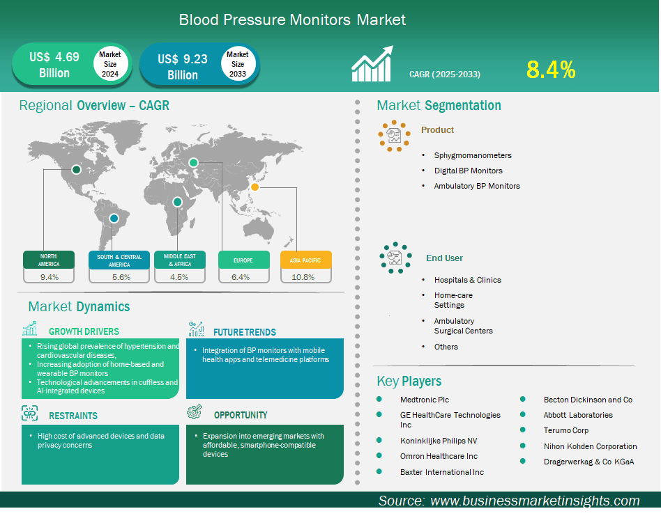 The blood pressure monitors market size is expected to reach US$ 9,256.01 million by 2033 from US$ 4,691.67 million in 2024, reflecting a strong growth outlook. The market is estimated to register a compound annual growth rate (CAGR) of 8.4% from 2025 to 2033, driven by an aging population, rising prevalence of hypertension, and advancements in digital health technologies.