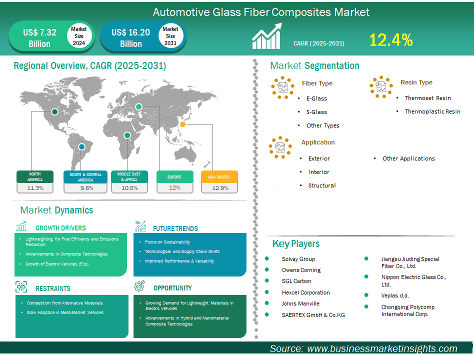 According to market analysis, the automotive glass fiber composites market size is expected to reach US$ 16.20 billion by 2031 from US$ 7.32 billion in 2024. The market is estimated to record a CAGR of 12.4% from 2025 to 2031, driven by stringent emission regulations, rising electric vehicle production, and growing demand for lightweight automotive materials