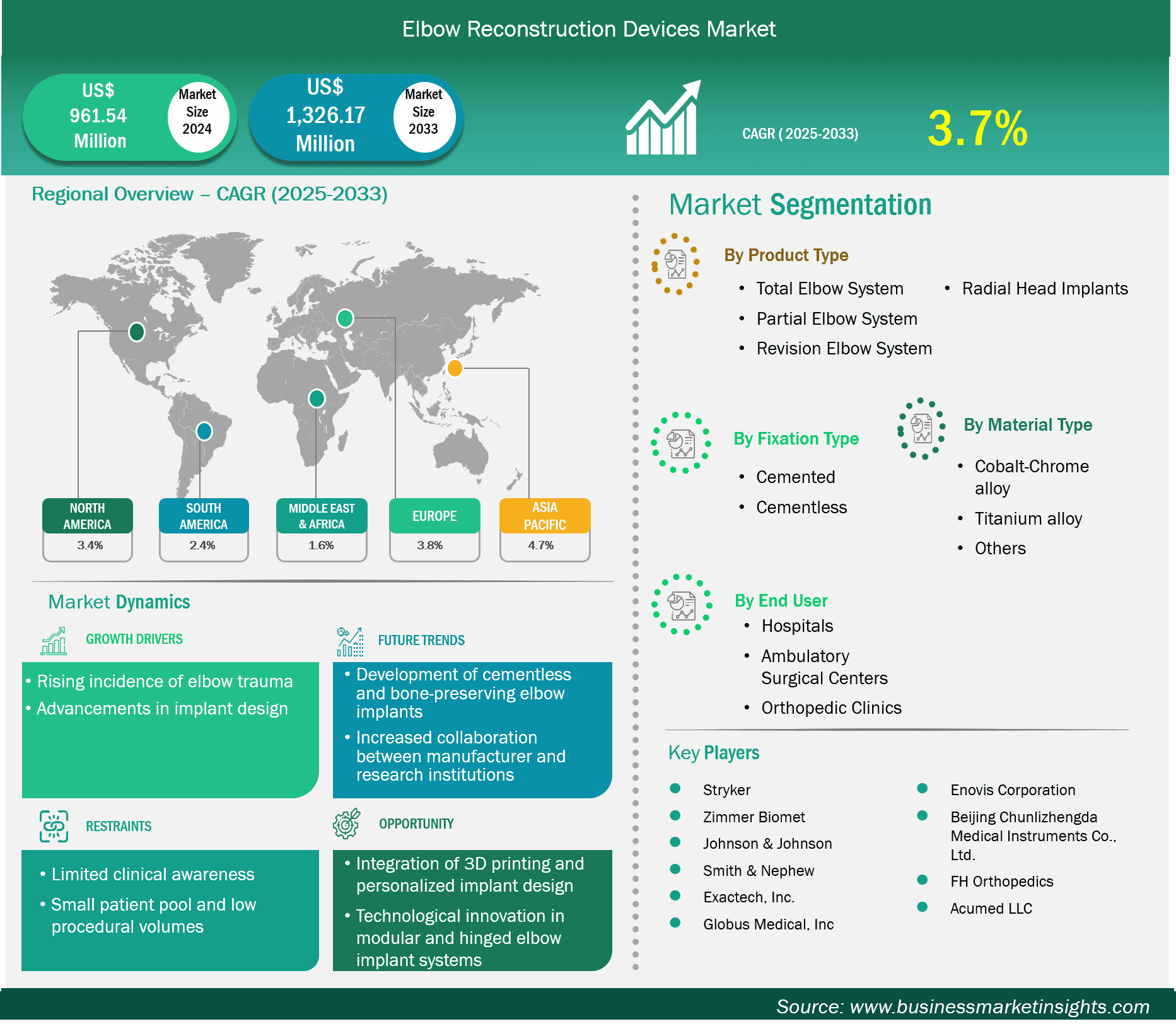 According to market analysis, the elbow reconstruction devices market size is expected to reach US$ 1,326.17 million by 2033 from US$ 961.54 million in 2024. The market is estimated to record a CAGR of 3.7% from 2025 to 2033, supported by an aging population, rising sports-related injuries, and increasing adoption of orthopedic surgical interventions.