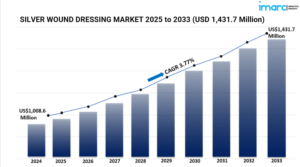 The global silver wound dressing market size was valued at USD 1,008.6 Million in 2024 and is projected to reach USD 1,431.7 Million by 2033, growing at a CAGR of 3.77% during the forecast period 2025-2033. This growth is driven by increasing chronic wounds prevalence and advanced healthcare infrastructure, especially in North America, which currently holds over 48.7% market share. Silver’s antimicrobial properties and effectiveness in reducing hospital stays and treatment time enhance demand for these wound care solutions. For more details visit Silver Wound Dressing Market.