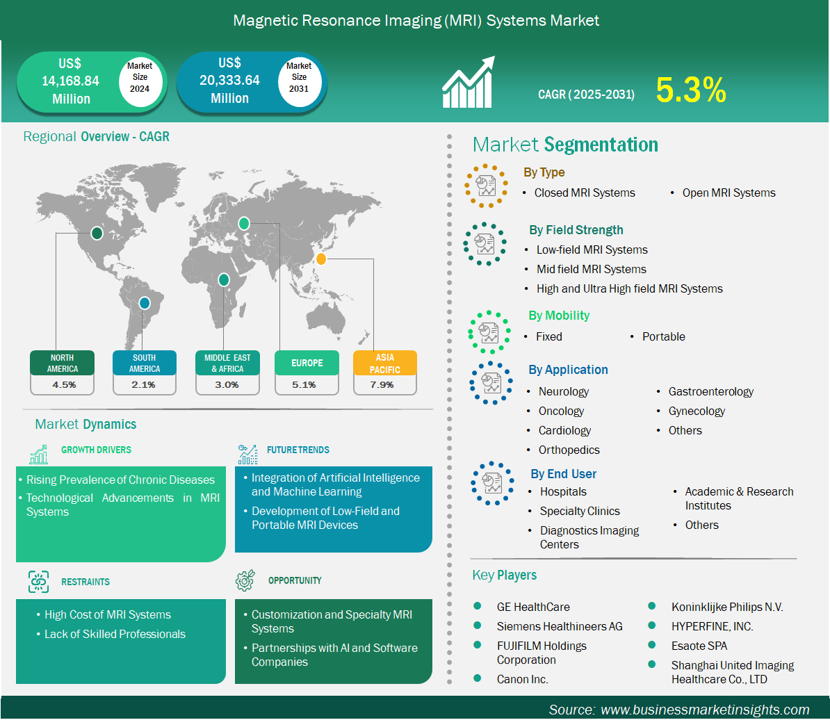 The magnetic resonance imaging (MRI) systems market size is expected to reach US$ 20,333.64 million by 2031, increasing from US$ 14,168.84 million in 2024. The market is estimated to record a compound annual growth rate (CAGR) of 5.3% from 2025 to 2031, driven by increasing diagnostic imaging procedures and continuous innovations in MRI technology.
