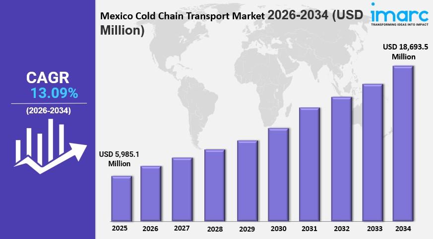 The Mexico cold chain transport market size reached USD 5,985.1 Million in 2025. Looking forward, IMARC Group expects the market to reach USD 18,693.5 Million by 2034, exhibiting a growth rate (CAGR) of 13.09% during 2026-2034. Increasing demand for perishable goods, expansion of e-commerce, growing consumer preference for fresh food, regulatory requirements for food safety, and the rise of pharmaceutical logistics, fostering investments in temperature-controlled transportation infrastructure and technology, are some of the factors contributing to Mexico cold chain transport market share.