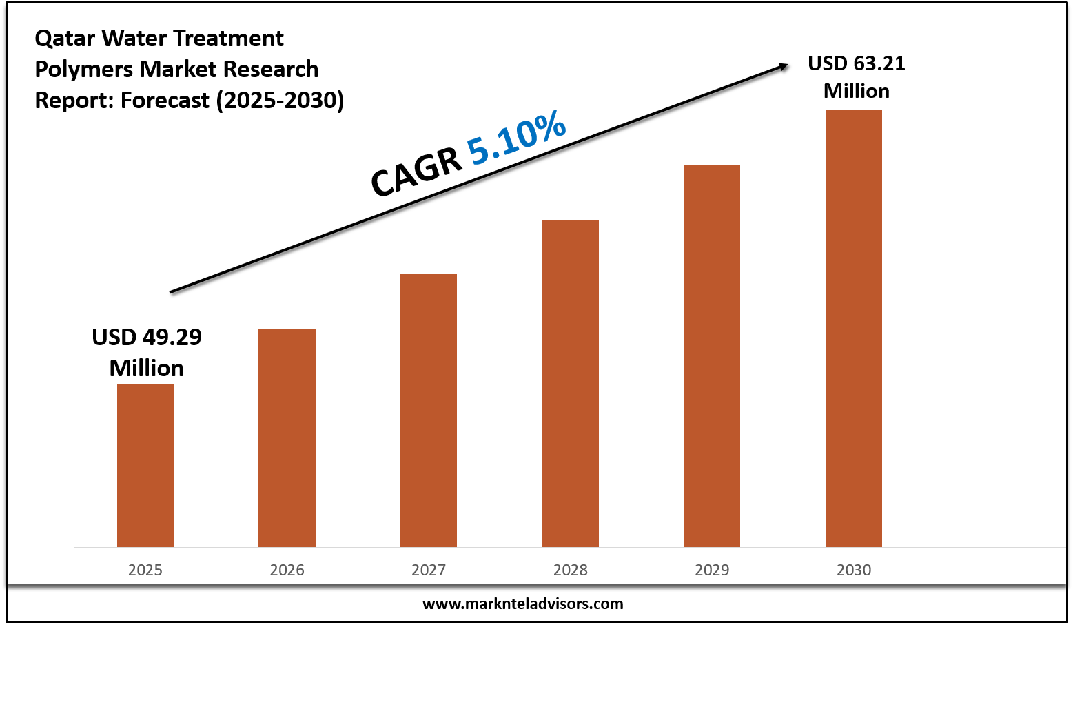 The Qatar Water Treatment Polymers Market, valued at approximately USD 49.29 million in 2025, is anticipated to expand at a Compound Annual Growth Rate (CAGR) of 5.10% through 2030, reaching an estimated USD 63.21 million. Key growth drivers include the country's heavy reliance on seawater desalination, escalating industrial discharges from sectors such as oil and gas, and government initiatives promoting water reuse. With the growing urban population, the demand for efficient wastewater management and treatment solutions becomes increasingly crucial, highlighting the vital role of water treatment polymers in Qatar's future.
